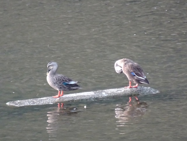 この場所を歩いていると川の中に鳥がいるのです。冬は渡鳥が多いのですが、春になって、最近はすっかり減ってしまい、渡って行かない鳥たちになりました。マガモとカルガモ・・・