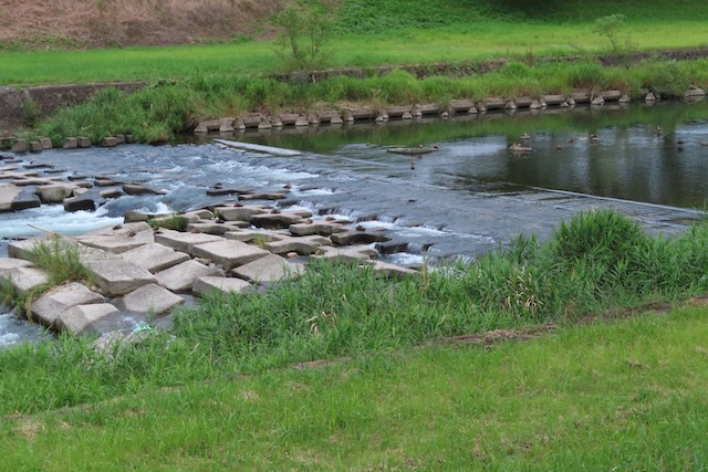 どういうわけなのか、全く解明できないことが5月の末から、起こってました。カモの数が激減したのです。何がどうなったのか?私が川島テキスタイルスクールに行ってて散歩できなかった間に、いつもの場所にカルガモの姿がいなくなったのです。私が歩いたり、自転車で走ったりするエリアには50羽を超える数のカルガモがいたのに・・
